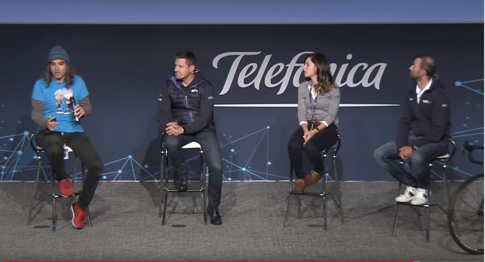 Figura 2: Chema Alonso presentando la colaboración entre Movistar Team y LUCA Chema Alonso, CDO de Telefónica, no podía faltar en esta jornada. En este caso junto con Movistar Team, el equipo ciclista representado por los ciclistas Alejandro Valverde y Lourdes Oyarbide, y Mikel Zabala, responsable de innovación del equipo. Una presentación para mostrar c