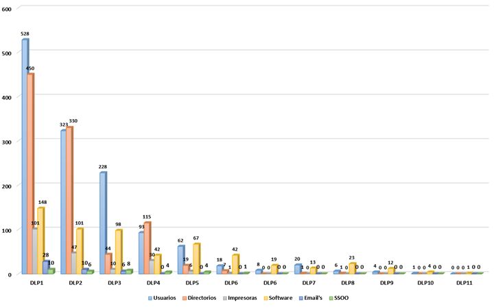 En función de la tabla anterior, se ha procedido a realizar un nuevo gráfico mostrando la cantidad de fuga de información producida por las empresas DLP estudiadas. Lógicamente, las entidades analizadas que sufren más fuga de información a través de los metadatos son las que también exponen un mayor número de documentos públicos en sus sitios web.