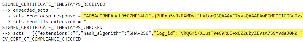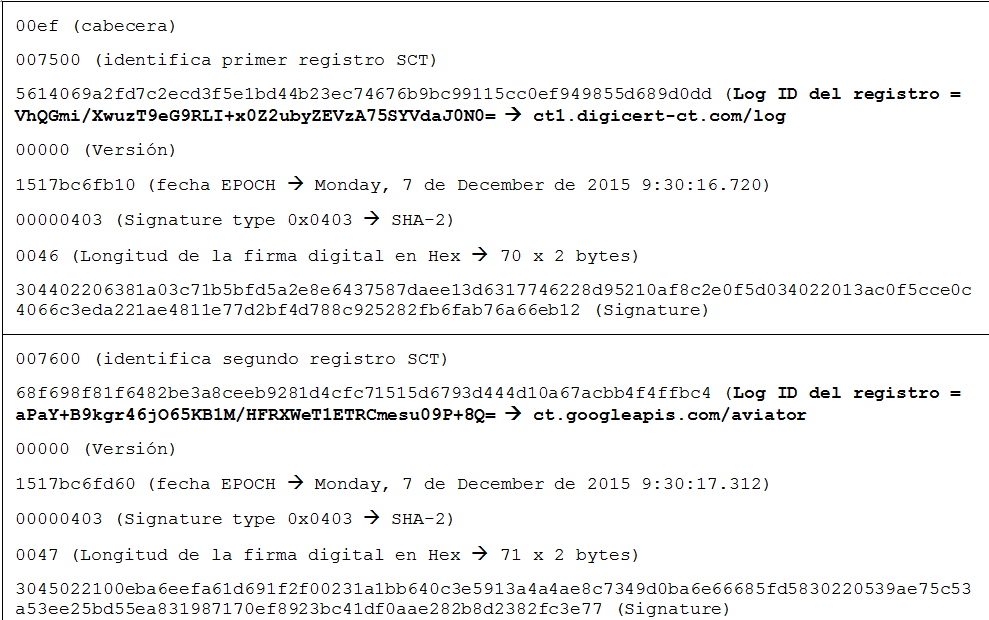 A modo de control, se puede tomar el primer Log ID en hexadecimal, convertirlo a BASE64 y verificarlo contra el listado público de Logs de Transparencia de Certificados.