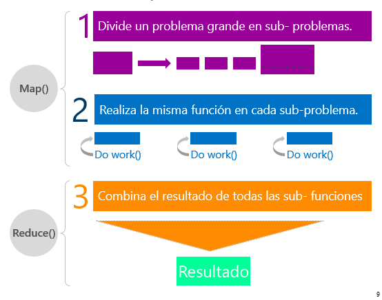 Reduce – “ Combina y reduce la cardinalidad”: la función “Reduce” recoge las repuestas a las sub-tareas en cada subnodo y las combina y agrupa para obtener la respuesta final.
