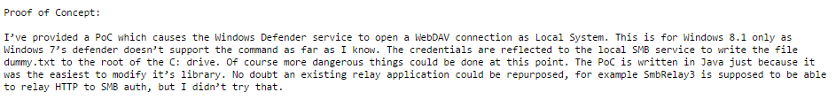 Ahora solo falta esperar que una petición HTTP generada desde un servicio con altos privilegios intente autenticarse por NTLM a algún sitio. Como tenemos un proxy HTTP en el equipo, capturamos las credenciales y se lanzan e inyectamos un comando. Todo se envía al servicio de escucha SMB interno. Ya está, el comando se lanzará con máximos privilegios. ¿Qué servicios generan peticiones HTTP autenticadas con NTLM privilegiados? Windows Update, Windows defender… El ataque aquí varía de versión a versión, pero es bastante fiable.