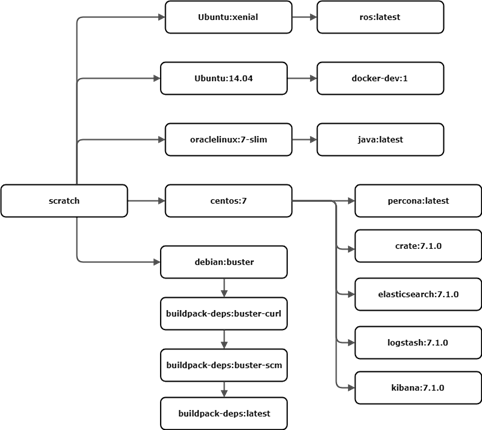 A continuación, ya sabiendo que las imágenes de Docker funcionan por capas y herencia (incluso de vulnerabilidades), diseccionamos en profundidad las vulnerabilidades encontradas. Para ello obtuvimos los dockerfiles correspondientes a su construcción y vimos cómo se componen las imágenes analizadas. En la siguiente figura podemos ver el esquema de herencia de las imágenes con más vulnerabilidades detectadas: