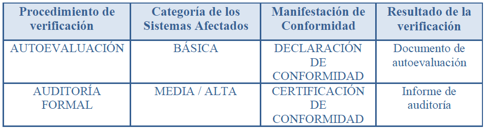 Anexo I (del ENS) mencionado, se establece que la conformidad con la norma pasa necesariamente por adoptar y manifestar la implantación de las medidas de seguridad requeridas para tal sistema, atendiendo a su categoría (básica, media o alta). Ahora, sólo nos queda aclarar cómo se obtiene esta conformidad, lo cual, es bastante claro y sencillo y también se desprende del ENS, esta vez, en su