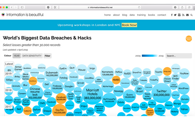 Si se necesitan “brechas” que mostrar, recomendamos Information is Beatiful que es un portal muy popular con varios estudios transformados en infografías, o como ellos lo llaman, el “arte de la visualización de los datos”. También en nuestro blog se pueden encontrar diferentes posts sobre investigaciones relacionadas con brechas de seguridad, como la interesante charla que presentaron los colegas Jaime y Pablo en la RootedCON 2019.