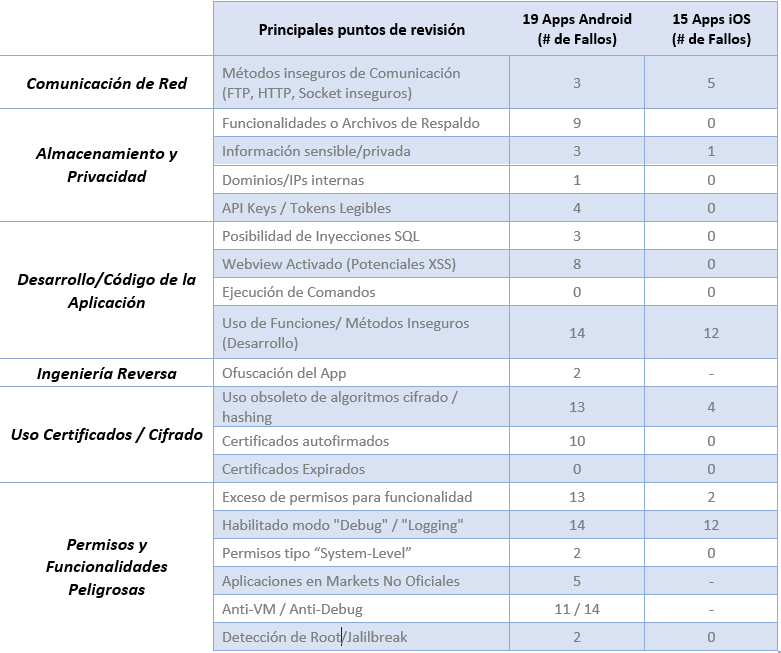 En nuestro caso, los resultados demostraron que, si bien se implementaron controles de seguridad para el desarrollo de este tipo de aplicaciones, se encontraron varias debilidades que deberían corregirse y, sobre todo, mantener la mejora continua en el proceso de desarrollo. Las vulnerabilidades encontradas conforme a los controles evaluados se encuentran en la siguiente matriz de resumen: