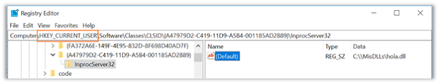 Suponiendo que esta última clave no existiese, estaremos frente a una aplicación vulnerable a COM Hijacking. Llevar a cabo la técnica no implica más que crear la siguiente estructura en el registro: