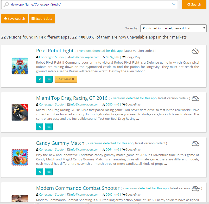 Hemos detectado con Tacyt, configurando un patrón de actuación del atacante, más de 200 apps con comportamiento similar y que provienen muy probablemente de la misma banda. Apenas 50 han sido retiradas. Ofrecemos aquí una lista con diferentes versiones de las que siguen online. No garantizamos que todas y cada una contengan exactamente la misma funcionalidad que la descrita por Dr.Web, pero sí una altísima probabilidad de que sean del mismo programador o sistema de programación, o sea, que pertenezcan al mismo grupo de desarrollo. Esto, cuando menos, garantiza su poca fiabilidad. En cualquier caso, todas corresponden a adware muy agresivo.