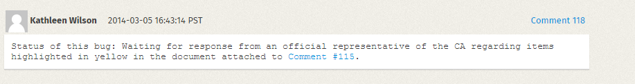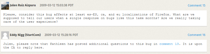 Algunos puntos se aclaran con una simple respuesta en Bugzilla, otros comienzan a dar problemas en los que Firefox no cede. Entre respuesta y respuesta, pueden pasar semanas o meses. La tensión se palpa y la comunidad española de Mozilla calcula el tiempo entre respuestas para recriminar quién tarda más en contestar o tomarse en serio el asunto (si Mozilla o la FNMT).