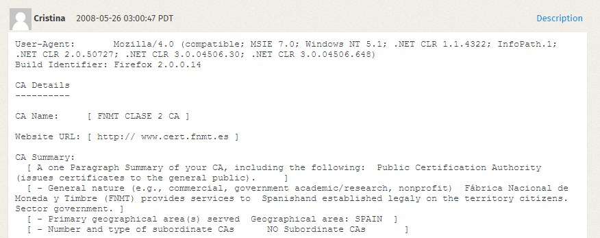 En mayo de 2008 se inicia la petición oficial. Por aquel entonces Firefox 3 estaba a punto de salir, y se valoraba (ingenuamente) la posibilidad de incluir ya el certificado en él. En octubre, se quejan del problema varios usuarios explicando que es muy necesario para decenas de gestiones online en España. Kathleen Wilson de la fundación Mozilla se encarga desde entonces de las gestiones para conseguir que el certificado pase las pruebas… y comienza el calvario.
