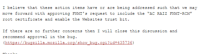 "Please move this. We all Spaniards need these certificates", se puede leer entre la discusión. Kathleen llega a 2010 con problemas menores y continúa con preguntas y necesidades no cubiertas para entrar en el club de certificados raíz de Mozilla. En este punto, es la propia FNMT la que retrasa el proceso por no cumplir ciertas especificaciones técnicas.