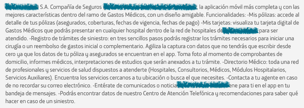 Las entidades de seguros pueden operar en uno o en múltiples servicios (hospitalarios, accidentes, automóvil, incendios, responsabilidad civil, etc.), con lo cual a día de hoy pueden desde una aplicación móvil algún usuario podría acceder a múltiples opciones como, por ejemplo, contratar un seguro medico, gestionar pólizas y reclamos, reportar siniestros, entre otros.