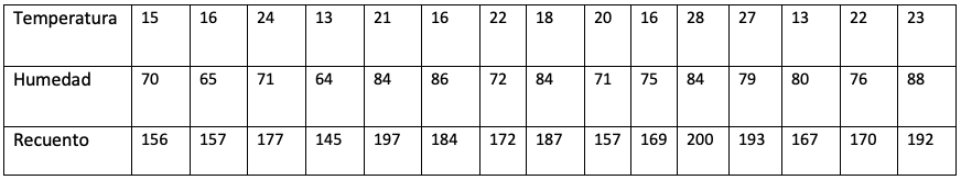 Veamos a continuación un ejemplo de un estudio sobre la abundancia (Recuento) de un parásito en 15 localizaciones diferentes en función de su temperatura y la humedad. Los datos obtenidos son los siguientes: