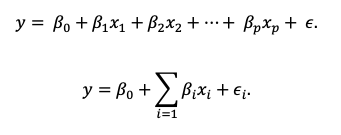 Nuestro modelo sigue de la siguiente relación entre las variables explicativas o independientes (x1,x2,x3,…xn) y la variable respuesta o dependiente (y):