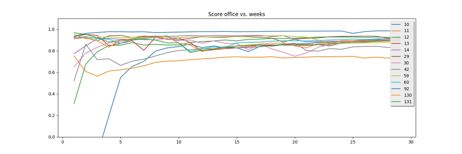 Con este enfoque y realizando un benchmarking global del algoritmo se consiguió llegar en la mayor parte de las oficinas analizadas a unos resultados de predicción con R2Score entre 0.8 y 1. También se pudo determinar el periodo de entrenamiento mínimo y óptimo para llegar al régimen de mayor R2Score, tal y como se visualiza en la