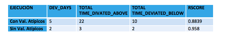 Con los nuevos datos limpiados de input, el algoritmo de predicción mejoró tanto los valores de R2Score como el número de días y minutos desviados, tal y como se muestra en la Tabla 1.