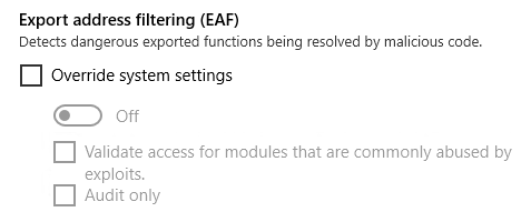 - EAF: Otra técnica para crear exploits sin que le estorbe el ASLR. El shellcode normalmente accede a la Export Table de una librería e intenta resolver la dirección de las API, habitualmente GetProcAddress. Export Address Table Filtering (EAF) y EAF+ son técnicas que incluyó EMET que pretenden filtrar ese acceso, para que no cualquiera pueda llegar a una DLL y pedir la dirección de esas funciones necesarias para ejecutar el código. Aparecieron varios trucos para eludirla: por ejemplo, acceder a la Import Table de una librería que se importe en cada proceso. El propio Microsoft avisaba en general de que EAF es un método de protección "débil" por sí mismo. Esta es curiosa porque según la propia Microsoft, no se ha implementado.