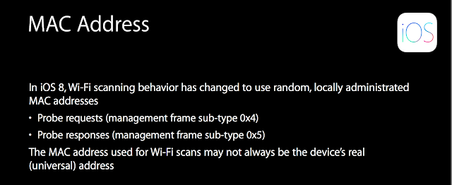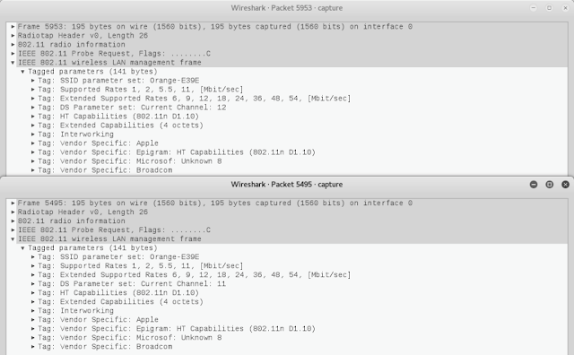 Con la llegada de iOS 9 se incorporaron mejoras, como Location Scans y Auto Join Scans, que permiten la aleatorización en los escaneos y asociaciones de redes wifi cautivas (como por ejemplo en los hoteles), así como en puntos de acceso público (Public Hotspots). Pero siempre habrá pistas para conocer si una misma interfaz está ofreciendo direcciones MAC "falsas". Como ejemplo práctico, observando una captura de probe request en un iPhone con iOS 10, vemos lo siguiente: