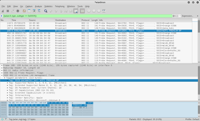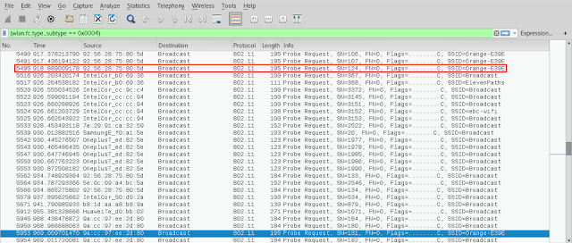 - Si miramos el último paquete probe request de la MAC 92:56:28:75:80:5d es el número 5566. El primero de la MAC 9a:cc:97:ee:2d:80 es el 5945. Con esto se pretende destacar que no hay cruce de paquetes entre ambas direcciones. Cuando termina uno, empieza otro sin colisiones. No se cruzan los valores. Algo parecido ocurre con es el número de secuencia (SN). Se puede observar que la secuencia sigue de manera más o menos normal (hay un buen salto, pero tiene relación) aun cuando ha cambiado la MAC.