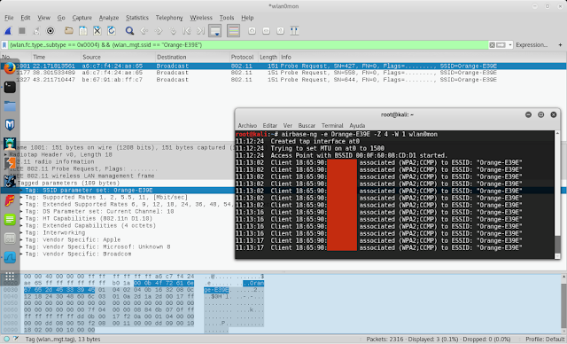 Se puede ver que la MAC no se transmite por los paquetes probe request hasta que el dispositivo está conectado, y en este caso, a no ser que se sepa la contraseña del punto de acceso, el cliente nunca se conectará al punto de acceso falso. Pero sí que intentará hacer la autenticación y por tanto se obtiene en ese momento la dirección MAC. No se captura la MAC usando Wireshark, pero sí que se captura a través de la creación del AP falso, en este caso con la herramienta airbase-ng, de la suite de aircrack-ng.