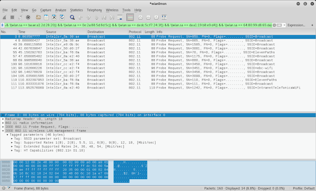 - El problema de los SSID ocultos: Se vuelve a presentar el problema de los SSID ocultos, y este sí que puede ser un factor determinante para conocer si una MAC está cambiando. En la siguiente captura se han seleccionado los dos paquetes que comparten un SSID concreto (oculto) y que viene a significar que una red oculta recordada por la interfaz, está cambiando su MAC, pero preguntando de forma oculta por el SID que recordaba cada cierto tiempo. Se podría llegar a argumentar que podrían ser dos dispositivos diferentes de un mismo usuario que se hayan conectado a la misma red, pero si unimos todas las razones anteriormente expuestas, se puede suponer con bastante probabilidad que el dispositivo en cuestión es el mismo con diferentes MACs. Para terminar de ver todo esto de forma más clara, si se aplica el filtro que busca por ese SSID oculto obtenemos lo siguiente: