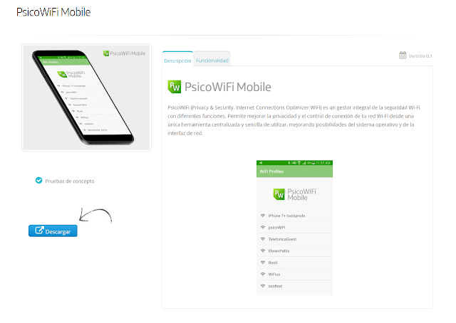 - Para Android, disponemos de una prueba de concepto llamada PsicoWiFi Mobile, disponible desde esta dirección: https://www.elevenpaths.com/es/labstools/psicowifi-movil/index.html