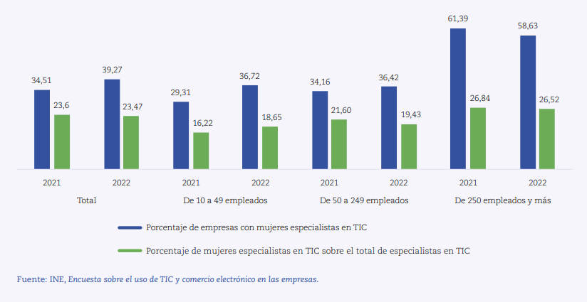Así lo reflejan los datos del Instituto Nacional de Estadística (INE), que indican que la proporción de empresas que cuentan con mujeres especialistas en tecnologías de la información y las comunicaciones ha crecido del 35% al 40% en un año.
