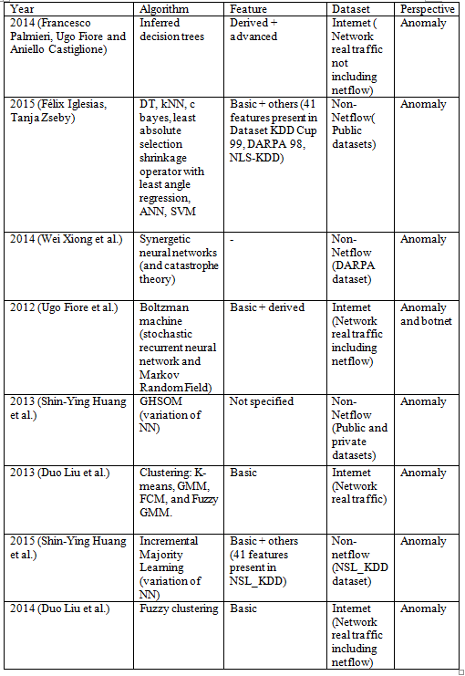 Los resultados del estudio 2015 (Félix Iglesias, Tanja Zseby) reflejan que ANN obtiene mejores resultados que DTC, kNN, Bayes, SVM en el caso en el que se seleccionan 16 características de las 41 que componen los conjuntos NSL-KDD o KDD.