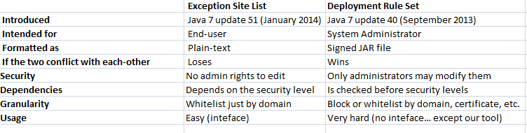 Al principio solo existían las Deployment Rule Set para intentar crear listas blancas o negras de la ejecución de applets de Java. Estaba destinado a administradores que deseasen bloquear RIAs (applets de Java y Java Web Start Applications, conocidos en conjunto como Rich Internet Applications) por dominios, certificados o nombre. Esto suponía un avance pero era terriblemente complejo de implementar. Los pasos que había que seguir eran: