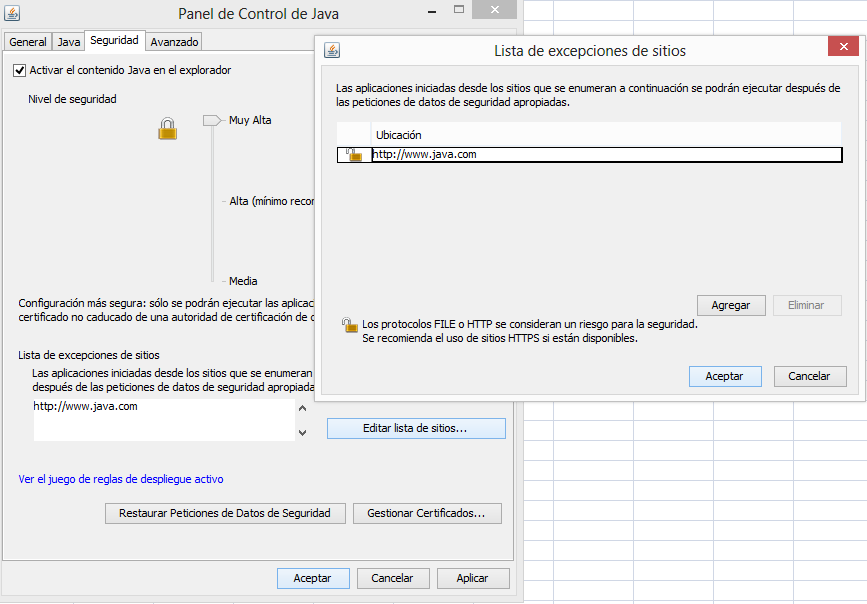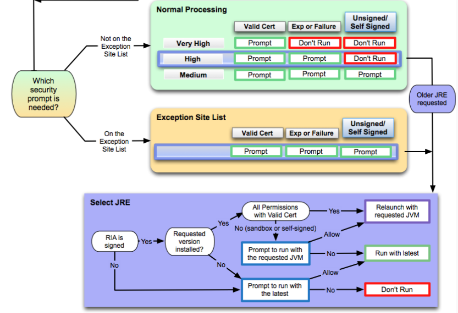 En resumen, las Exception Lists afecta solo a las "preguntas" que hace Java antes de ejecutarse. Nunca las hará desaparecer, pero tampoco los bloqueará, incluso si la seguridad está establecida a "alta". Las listas de excepción no tienen efecto si la seguridad está establecida a "media" (cosa que ya no existe en la rama 8, en la que solo han dejado "Alta" y "Muy alta". Este diagrama lo muestra de forma más clara: