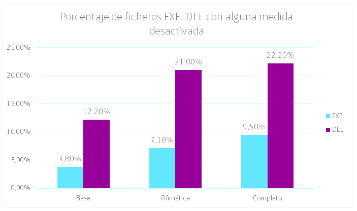 Los ficheros objetivo del estudio han sido los ejecutables (EXE) y librerías (DLL). Se han analizado todos los ejecutables en tres perfiles de instalación (Windows 10, Windows 10 con paquete ofimático, y Windows 10 con paquete ofimático y navegadores y lectores PDF). Hemos almacenado sus características, o lo que es lo mismo qué flags de los mencionados más arriba se encuentran activos en los ejecutables y librerías. Hemos analizado el siguiente número de ficheros por cada perfil: