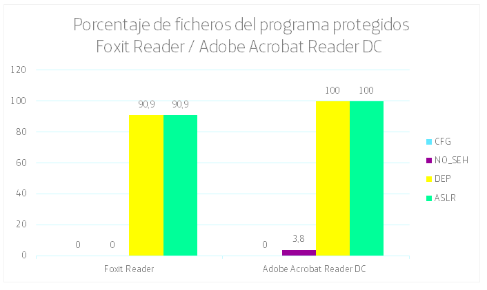 Entre los lectores de PDF más populares, Adobe (históricamente un desastre en seguridad) funciona en este sentido mejor que Foxit. El 100% de sus binarios tiene activado DEP y ASLR, aunque ambos ignoran la nueva medida de seguridad CFG.