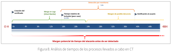 Hipotéticamente, el vector que aprovecharía un atacante, sería la ventana de tiempo desde que obtiene el SCT de los logs, hasta que el certificado es incluido en el árbol de Merkle. Este es el tiempo durante el que se posee SCT para validar ante los navegadores y sin embargo el certificado no es público o visible por los monitores. En base a esto y los resultados anteriores, hemos construido un cronograma (Figura 8) con los tiempos aproximados que se manejarían (actualmente) dentro de CT y la posibilidad de que un atacante sea detectado en función de estos tiempos.