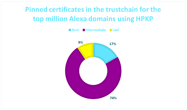 - 20% del top de dominios de Alexa usando HPKP sobre HTTPS usan uno o ningún pin, que resulta inútil desde el punto de vista del navegador ya que lo ignorará. La mayoría de ellos (un 73,65%) usan el certificado intermedio para el pinning.