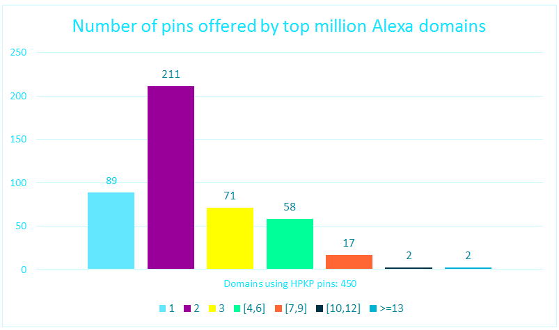 A la hora de implementar HPKP es importante respetar el número de pins requerido. A pesar de que los valores recomendados establecen usar entre 3 y 4 pins, algunos dominios usan desde un único pin (quebrantando la RFC) hasta 17, que resulta una clara irregularidad que reduce la eficiencia. Del top de un millón de dominios de Alexa, 282 de un total de 450 usan 2 o 3 pins, lo cual es correcto. Sin embargo 89 (19,8%) dominios usan uno o ninguno, lo que resulta inútil desde el punto de vista del navegador porque lo ignorará.