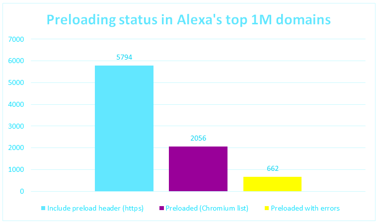 - Hay un total de 18197 dominios precargados en la lista de Chromium (compartida con Firefox). A fecha de diciembre de 2016, solo 2056 dominios del top de un millón de Alexa están es esa lista.