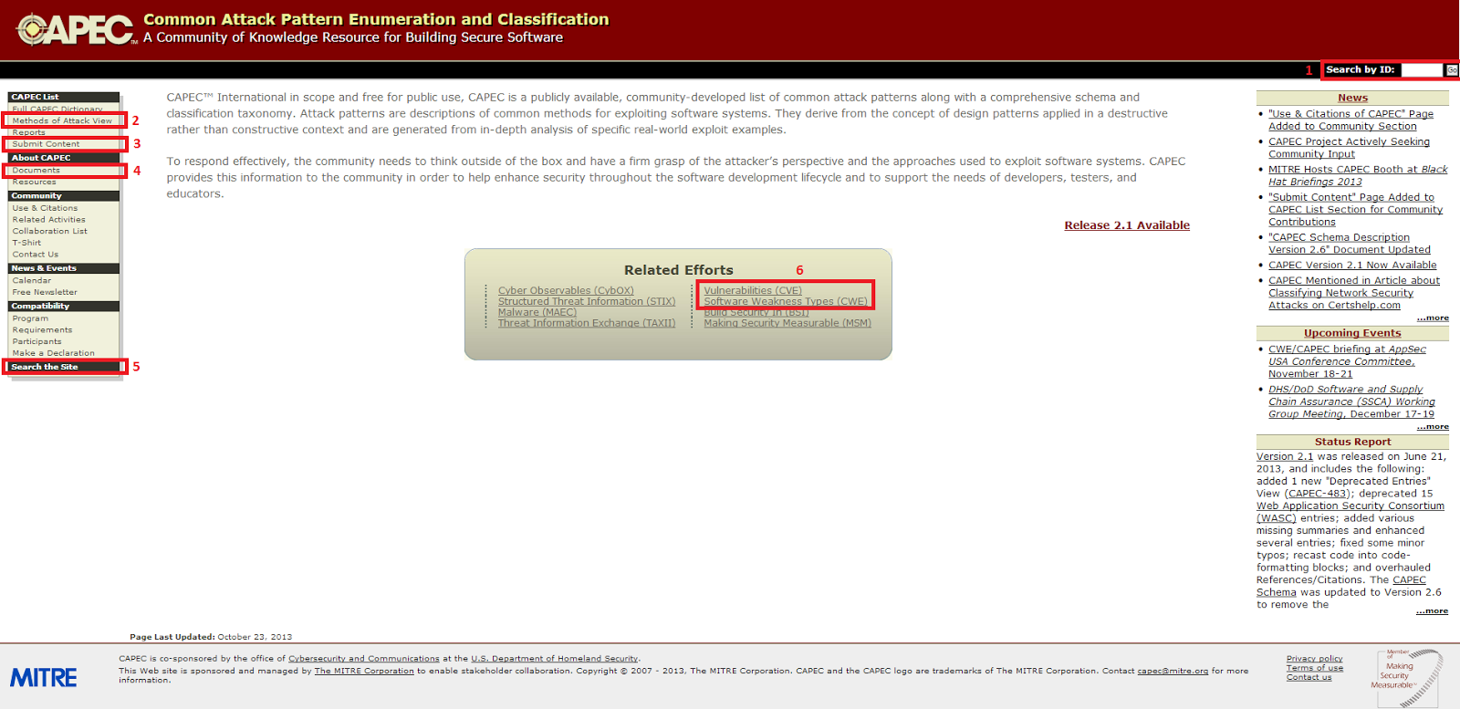 - En el enlace "Search the Site" pueden realizarse búsquedas específicas de patrones de ataques utilizando palabras clave. Esto es muy útil si no se conoce el CAPEC-ID del patrón pero se tiene una idea del nombre o las palabras que pueden estar relacionadas con él.