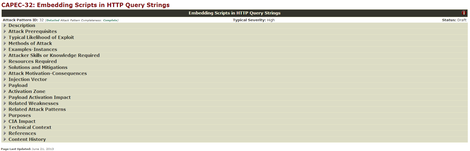 - En el enlace "Submit Content" se pueden proponer nuevos patrones de ataques para ser registrados en esta lista. Las instrucciones vienen detalladas en la página web. Sin embargo vale la pena mencionar que todo el proceso se basa en rellenar el formulario que nos suministran dentro del enlace con los detalles del ataque. Entre los más relevantes se encuentran: