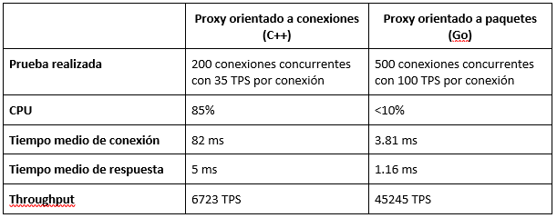 La siguiente tabla muestra una comparación de nuestro SafeProxy orientado a paquetes frente a una solución orientada a conexiones también desarrollada en ElevenPaths en el lenguaje C++.