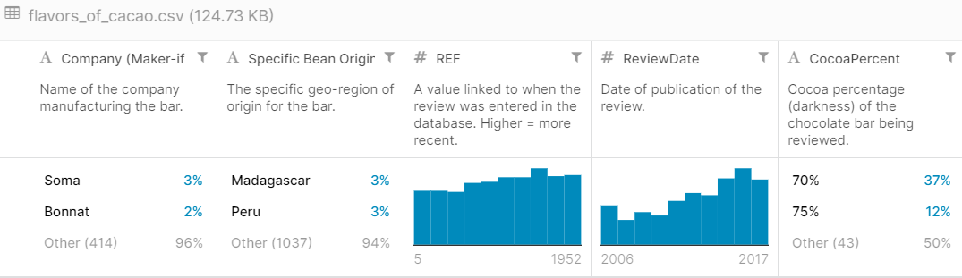 choco_data.columns = ['Company','Bar name','REF', 'Date','Cooa percent','C Location','Rating','Bean','Origin',]