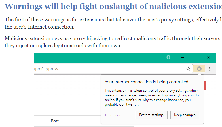 alertando de una manera más llamativa al usuario sobre la potencia de las extensiones. Aparecerá en la versión 62 de Chrome, y mostrará mensajes más visibles, por ahora si cambian la pestaña de "Home" o si se detecta tráfico "sospechoso" a través de un proxy. Insuficiente todavía, pero seguro que será mejorado en breve.