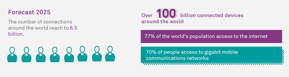 Según el estudio, el mundo inteligente llegará a serlo de verdad cuando todas las cosas sean capaces de tener conciencia propia y cuando todas estén conectadas entre sí. Para 2025, habrá 40 mil millones de dispositivos inteligentes y 100 mil millones de conexiones en el mundo. La ingente cantidad de datos generados por los dispositivos se irán integrando de forma extensiva en todos los sectores de la economía, generando a su vez sectores nuevos, como el Internet industrial de las cosas y los vehículos conectados.