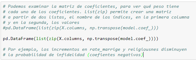 Con esta sentencia obtenemos las dos matrices que hemos mencionado antes, en las que los valores de “infidelity”(y) son iguales al producto de los valores de la matriz que representa las variables independientes (X) por unos coeficientes, más un término de corte. Al mismo tiempo indicamos que no use los valores de códigos de ocupación como numéricos sino como categóricos.