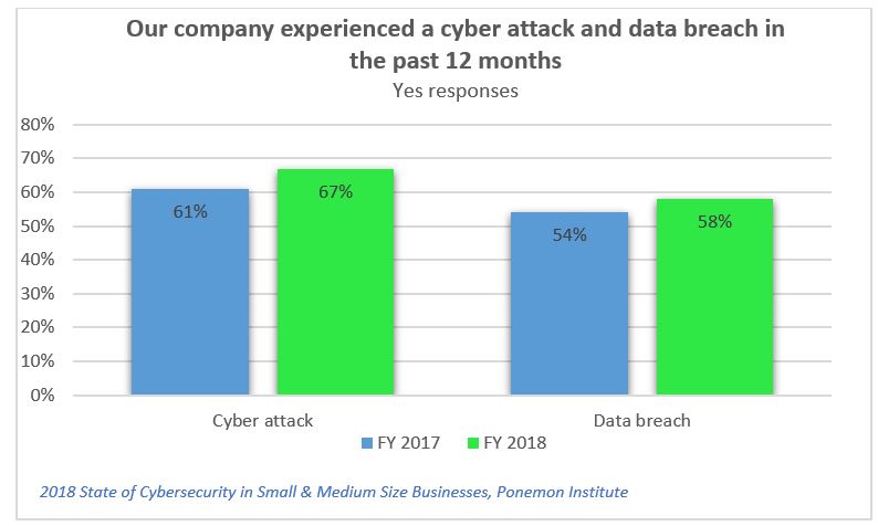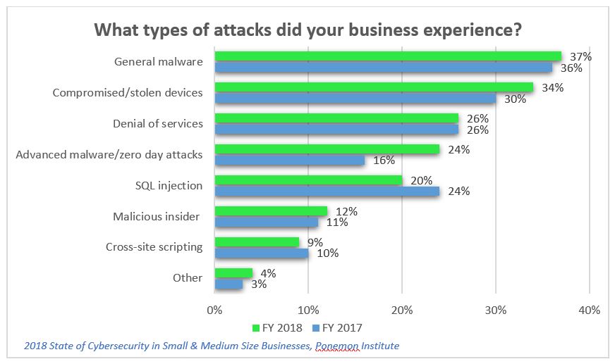 Del total de los ataques, el 40 % de los mismos van dirigidos a empresas pequeñas que, al no disponer de medidas de seguridad implementadas, se convierten en un objetivo fácil. Como resultado, el 70 % de las PYMEs han sido, en algún momento, atacadas.