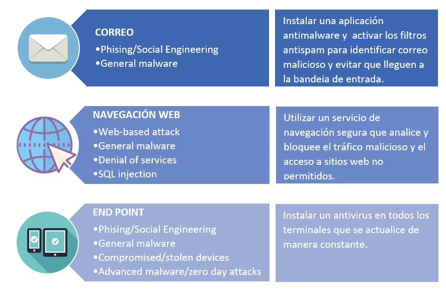 Los canales de entrada principales que un ciberdelincuente va a utilizar para atacar de manera masiva son tres. Por ello, se requiere una protección básica del correo electrónico, la navegación web y los dispositivos.