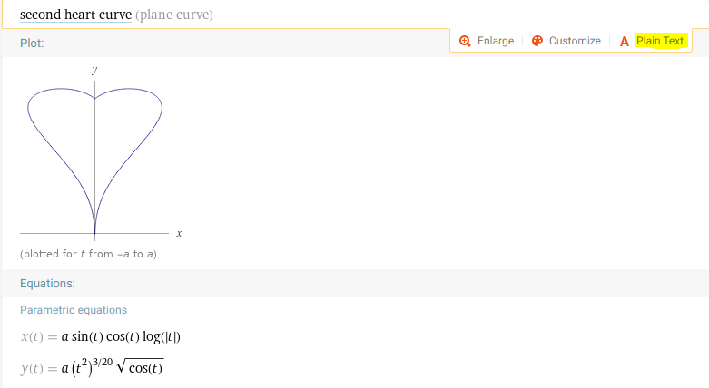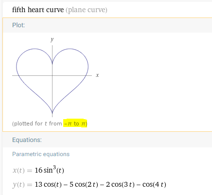 Por ejemplo, si probamos con la segunda curva corazón de WolframAlpha, vemos que resulta sencillo copiar las fórmulas (con la opción de "Plain text") y transformarlas para dibujarlas con Python.