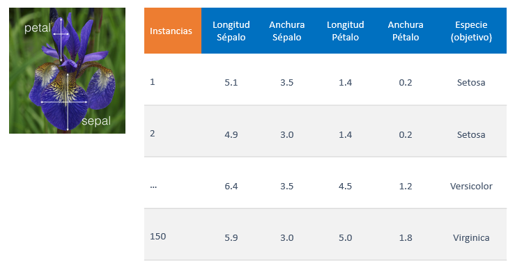 Este dataset se usa como datos de entrenamiento para un modelo de machine learning cuyo objetivo es determinar de forma automática la especie a la que pertenece una determinada flor, a partir de las medidas 4 atributos o características. En particular, la longitud y la anchura de sus pétalos y sépalos expresadas en centímetros. Por tanto, se trata de un problema de 4 dimensiones, en el que la variable objetivo (target) es la especie. Los datos se pueden representar en forma de una matriz de 150 filas (los datos de cada flor), por 4 columnas (las medidas de sus pétalos/sépalos). La quinta, corresponde a la variable objetivo, la especie.