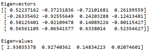 En este ejemplo, construiremos una matriz de proyección que convertirá el conjunto de datos inicial (de 4D) en un conjunto de datos de 2D centrado en las sus componentes principales (las direcciones de los autovectores correspondientes). De esta forma, la tarea de interpretar los patrones de información contenidos en los datos, será mucho más sencilla. Para ello, primero creamos la matriz de proyección a partir de los autovalores principales con el siguiente código: