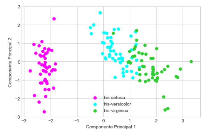 Y ¡ya está!. Hemos conseguido reducir el conjunto de datos de trabajo inicial a un conjunto de datos de dos dimensiones que aún así conserva la información más esencial. de forma que nos resultará mucho más sencillo el trabajo de crear un modelo de clasificación a partir de estos datos. Como ya indicamos anteriormente, es una técnica muy frecuente, ya que es sencilla y facilita mucho el trabajo posterior.