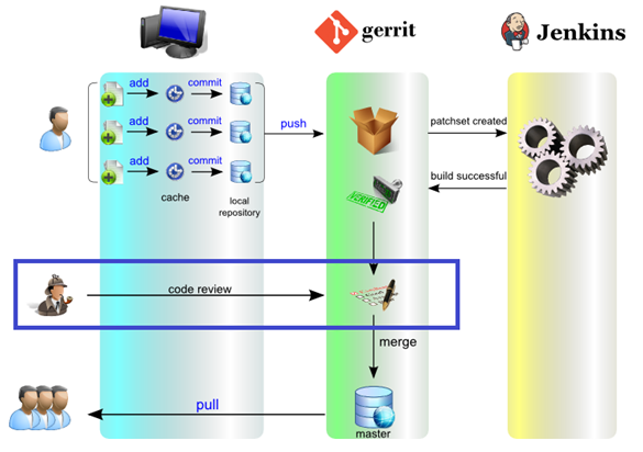 En la figura anterior, hemos enmarcado en azul la acción que realizaría un tester para realizar una inspección de código tras recibir una nueva actualización por parte de los desarrolladores. En este caso, si el evaluador considera que el código es correcto y funcional aceptará el cambio y este pasará a ser incluido como parte del proyecto final (en un repositorio centralizado). En caso contrario se pedirá una rectificación o "patch set" para que el cambio que se pretendía introducir sea válido tras la corrección (no se puede dar por válido un cambio tras una rectificación sin antes volver a analizar el código fuente del cambio).