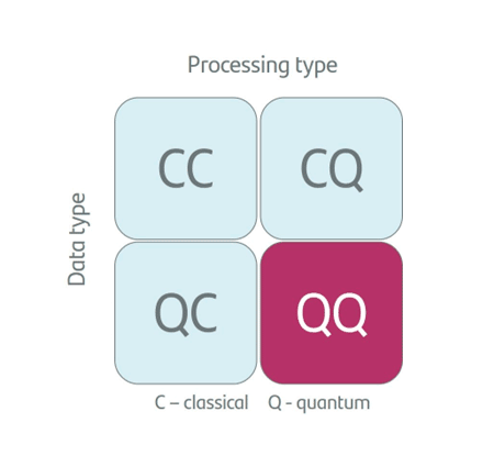 - CQ (Datos clásicos, procesamiento cuántico): El "Santo Grial" actual. Usar datos clásicos (imágenes, texto…) en un ordenador cuántico para aprovechar su capacidad de cómputo infinitamente superior.